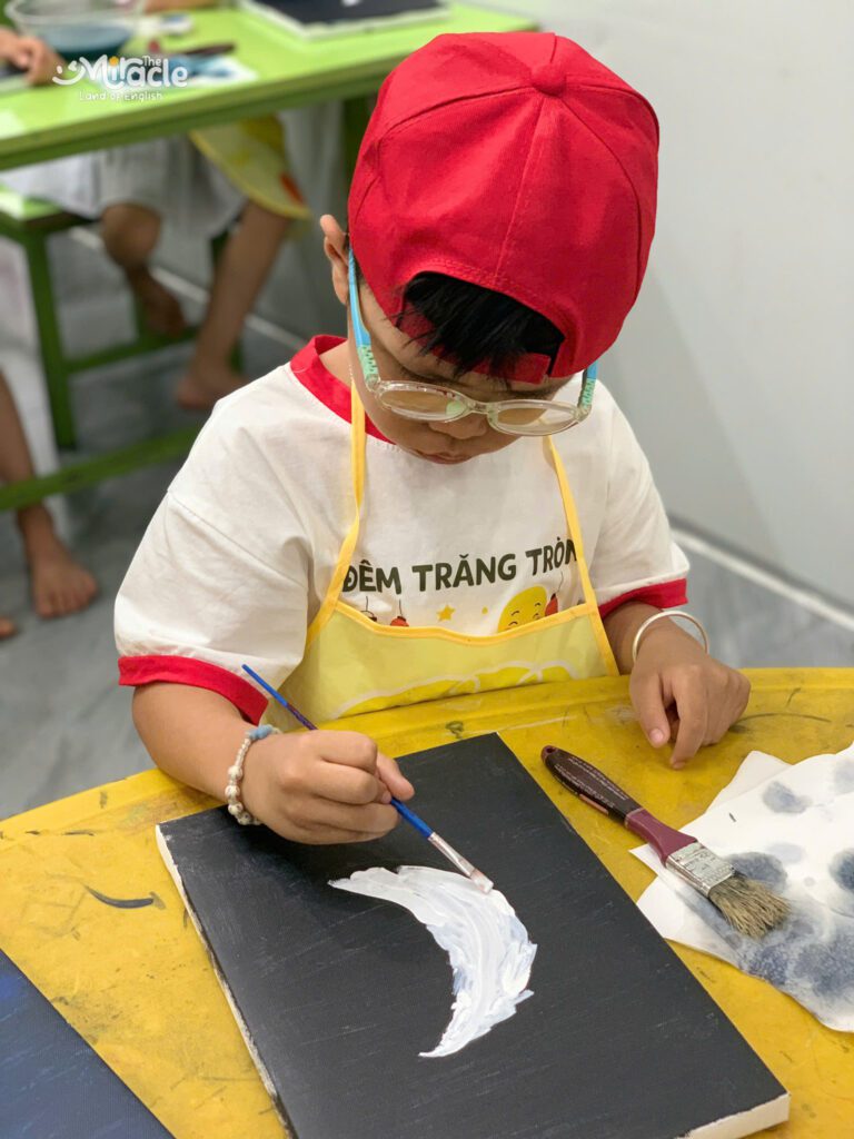 Các “hoạ sĩ nhí” thoả sức sáng tạo với cọ vẽ, màu sắc và trí tưởng tượng phong phú của mình. Những hình ảnh quen thuộc mùa Trung Thu như ông trăng, thỏ ngọc lần lượt hiện lên trên từng khung tranh, vừa gần gũi vừa rực rỡ.